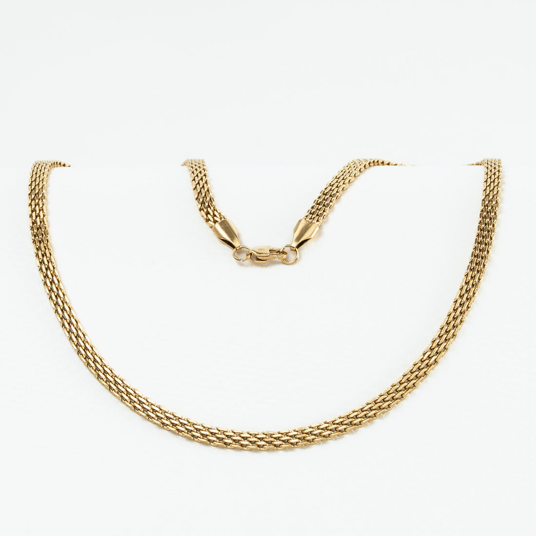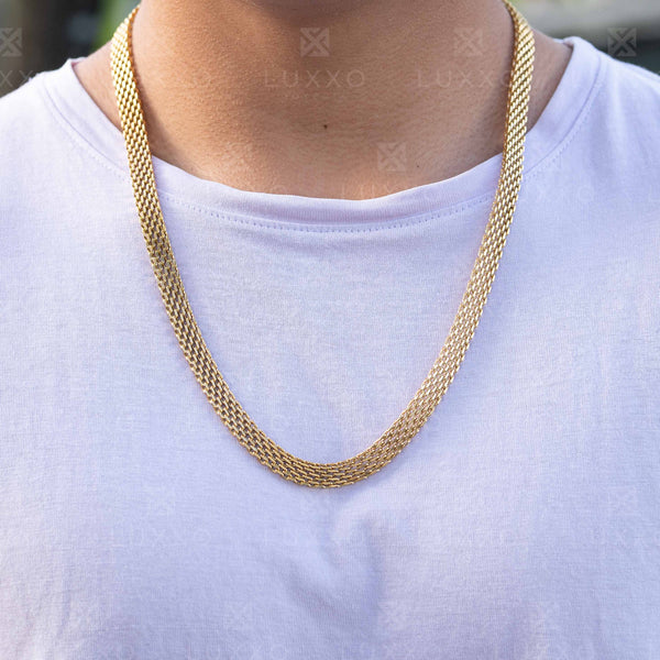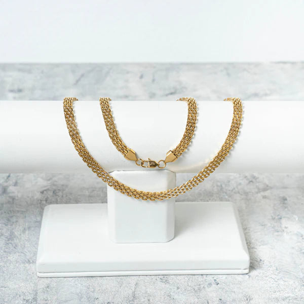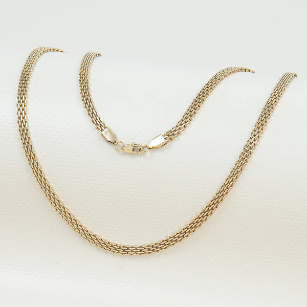 Cadena Chinesca en Oro Laminado Italiano 18K, reconocida por su entrelazado uniforme y elegante, que aporta un brillo continuo y una apariencia sólida. Su diseño clásico la convierte en una pieza atemporal, resistente y versátil, ideal para usar sola o combinada con otros accesorios.