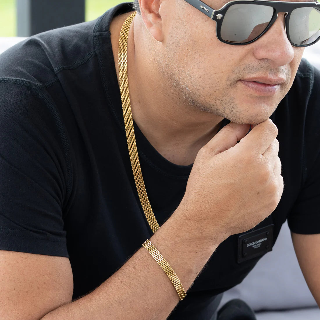 Su tejido compacto y uniforme genera un brillo intenso y sofisticado que resalta sobre cualquier outfit. Ideal para usar sola como pieza protagonista o combinar con pulsera del mismo estilo para un look más completo y moderno.