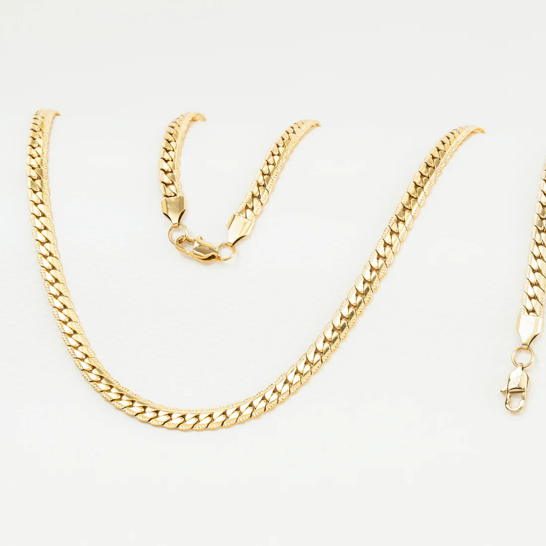 Combo Cadena y Pulsera Grabada en Oro Laminado Italiano 18K, con diseño robusto y acabado brillante que resalta cada detalle del grabado. Un conjunto elegante y masculino que aporta presencia, estilo y sofisticación en cualquier ocasión.
