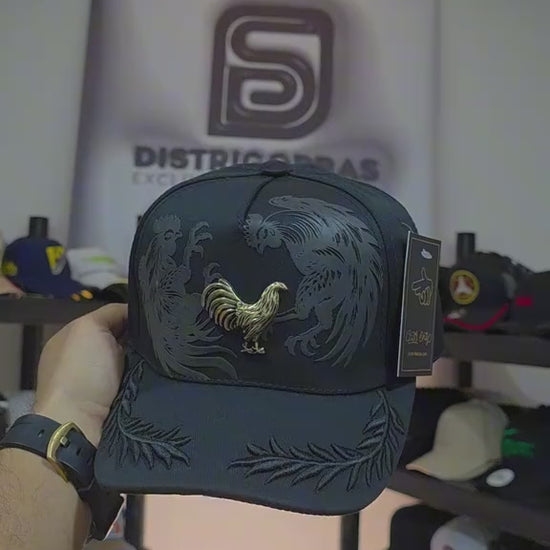 Esta gorra premium en color negro destaca por su diseño sobrio y sofisticado. Incorpora un emblema frontal metálico con figura de gallo, símbolo de fuerza, carácter y liderazgo. Los grabados decorativos tono sobre tono en el panel y la visera aportan profundidad y un acabado de alto nivel.